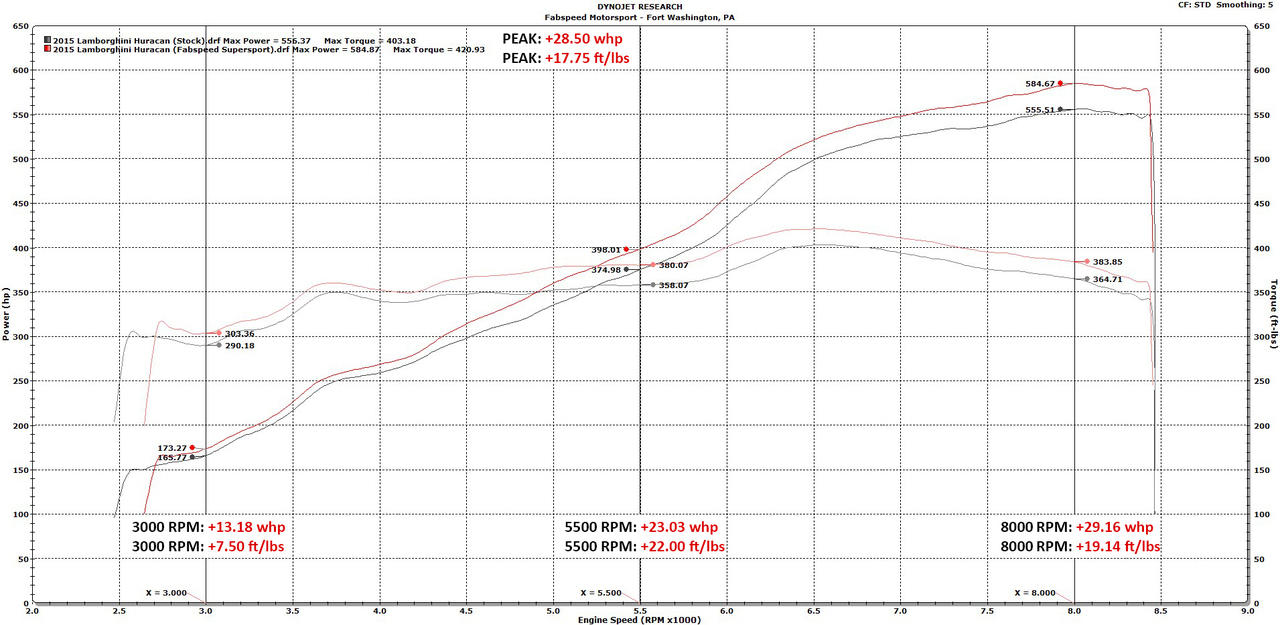 The factory exhaust on the Lamborghini Huracan is a very heavy, very restrictive system. The muffler is comprised of multiple chambers, filled with perforated tubing, wool packing, and a set of secondary catalytic converters. The exhaust gas must force its way through all of this in order to exit the system, which robs the car of considerable power. Fabspeed's Valvetronic Supersport X-Pipe Exhaust System solves these flow issues, providing significant power gains, weight savings, and an absolutely intoxicating sound.