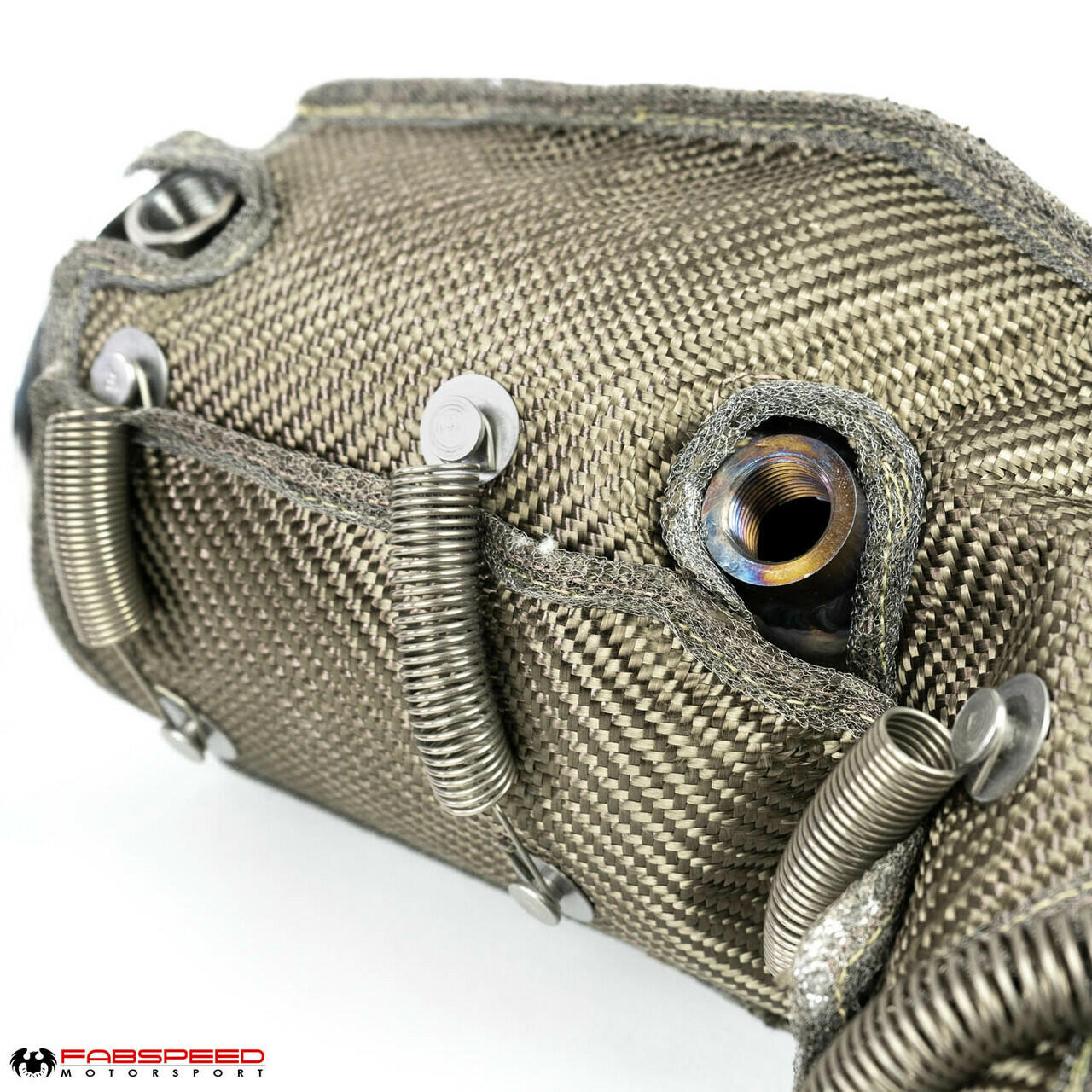 Included only at Fabspeed Motorsport. Protect your engine components from intense heat with thermal blankets. Keeping heat in the exhaust maintains the maximum velocity of exhaust gasses, allowing the turbos to spool faster while ensuring maximum power is extracted through increased thermodynamic efficiency and flow. Fabspeed thermal blankets are rated to 1800 degrees. T321L Stainless steel mesh over a 321L stainless steel inner liner covering ceramic insulation makes direct contact with the downpipes. The basalt fabric exterior covers sewn with stainless steel mesh covering all edges and high quality stainless steel spring fasteners ensure longevity. Fabspeed thermal blankets are exclusively manufactured by a military defense contractor!