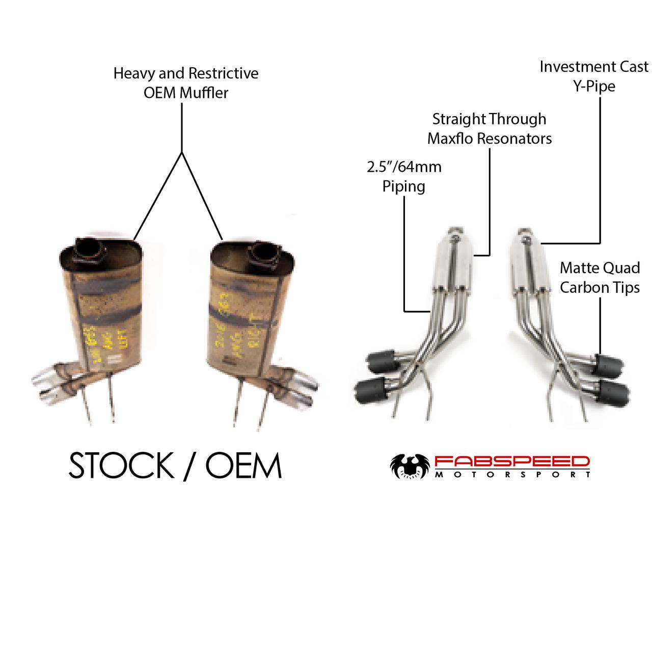 Replace your extremely heavy restrictive factory Mercedes Benz mufflers with dyno developed and proven Fabspeed Maxflo performance exhaust system for a more muscular AMG V8 sound and significant weight reduction.