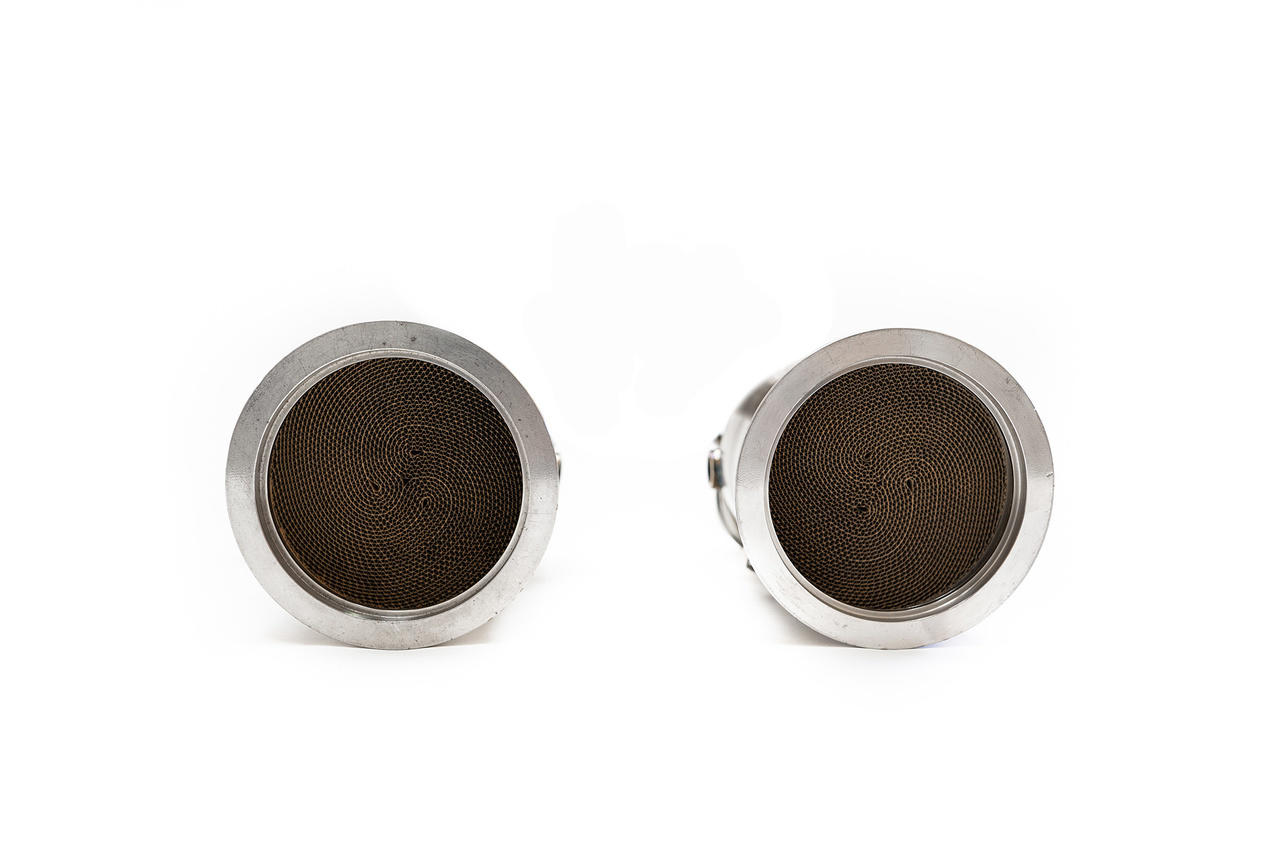 Much better enhanced sports car sound and turbo spooling due to free flow catalytic converters. These are the very largest HJS HD German cores that will fit on this car. There is NOTHING bigger or better than the HJS catalytic converter that Fabspeed Motorsport has utilized to give our worldwide GT2RS enthusiasts the very best superlative sports car sound, reliability and power. Beware and do not buy any other brand of catalytic converter.