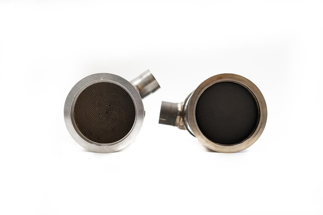 Replace the restrictive OEM ceramic GT2RS 700 cell catalytic converters with ultra free flow HJS German Imported tri-metallic race quality 200 cell HD cores that flow 92% to 93% of a straight pipe. Fabspeed Motorsport USA is the Exclusive Importer for HJS Emissions technology Deutschland Germany for all of North and South America. We use the very best largest imported 200-cell HJS Sport Cats that immediately reduce backpressure and significantly increase exhaust flow for better power and throttle response and improved superlative GT2RS dynamic sports car sound!