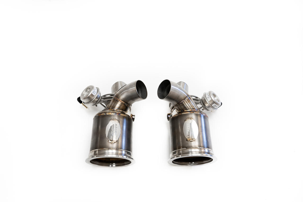 Simple direct replacement bolt on HJS catalytic converters for the ceramic GT2RS cats and bolt-on directly to the titanium GT2RS OEM center muffler. These are the very largest HJS HD German cores that will fit on this car. Guaranteed 92% flow of a straight pipe with no Check Engine lights and NO ECU tune required. Fabspeed also uses Helical U.K. imported 3.0" 76mm vacuum actuated exhaust valves. Helical LTD. Aerospace England supplies these ultra high temperature Inconel 625 stainless steel valves to Porsche, Ferrari, Mclaren, Aston Martin as OEM due to bulletproof reliability. If it's NOT engraved with Helical on top it will fail, rattle or melt internally. If its not a Helical exhaust valve it will not work. DO NOT put any brand of exhaust on YOUR CAR UNLESS it says HELICAL U.K. - virtually everything being sold is 100% Chinese Guaranteed to FAIL alibaba $45 cheap junk exhaust valves - that will rattle, break or set off fault codes and CAN NOT Be fixed. SERIOUSLY- if you contemplating a purchase DEMAND Helical U.K. aerospace exhaust valves!