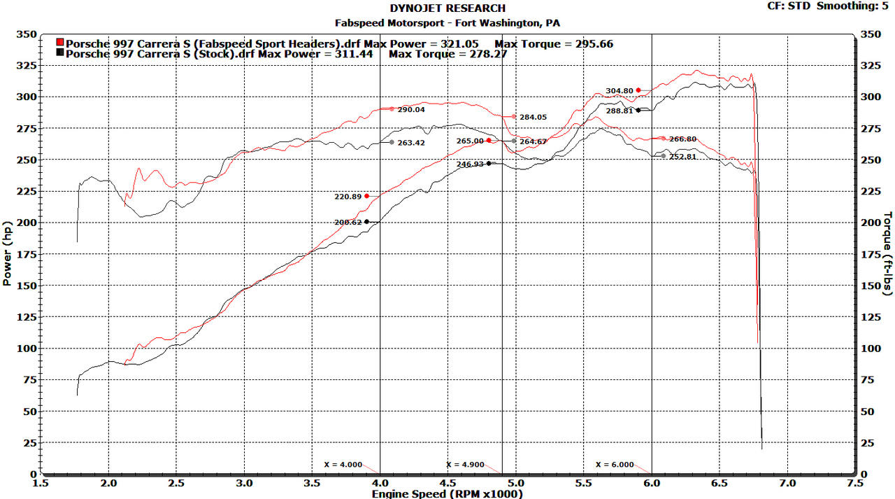 These headers are the most effective way to increase power on your naturally aspirated 997. On our Dynojet we saw a whopping 20 whp and 27 ft/lbs of tq at 4000 RPM. Peak gains were 10 whp and 17 ft/lbs of tq.