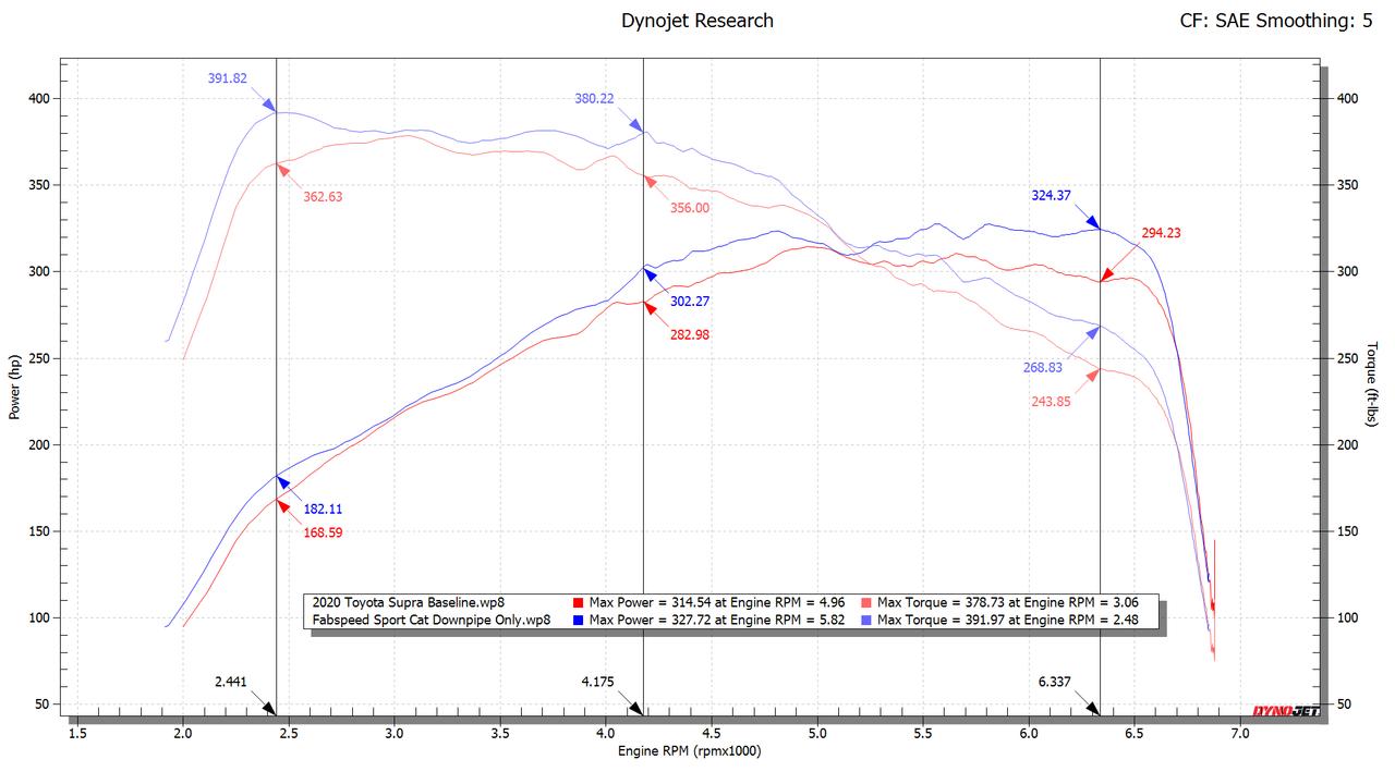 When we dyno tested our Sport Cat on a 2020 Supra it made 13 whp at the peak and 13 ft/lbs of torque at the peak. We saw curve gains of 29 ft/lbs of torque at 2400 rpm and 30 whp at 6300 rpm! And that's without a tune. Check out our XperTune for even bigger gains with our Sport Cat.