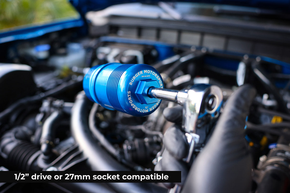 The Burger Motorsports billet aluminum magnetic Bronco oil filter cover directly replaces your weak OE plastic cap for greater protection, ease of removal/install, and great looks under the hood. You can use a 3/8" inch drive ratchet or torque wrench to install and remove. The built-in 32mm hex head does not require a special removal/install tool like the factory cap. Uses the OE oil filter, filter housing o-ring, and filter insert. Anodized for protection. This quality part is a must for any serious BMW owner.