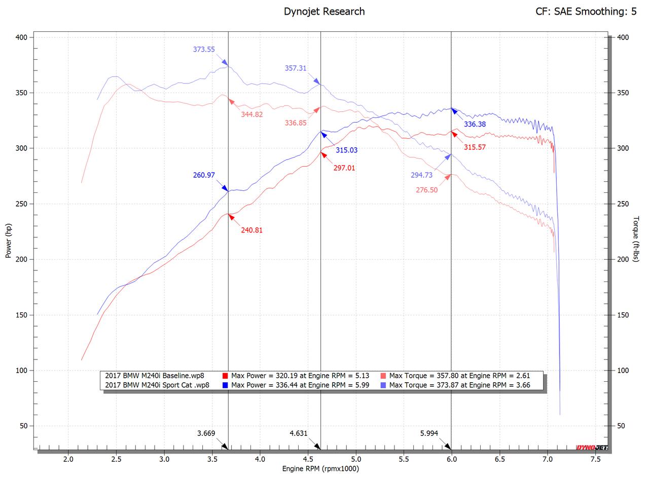Replacing the restrictive factory catalytic converter is the only exhaust upgrade that nets you real power on the M240i. On our in-house DynoJet, our high-flow Sport Cat Downpipe made max gains of 29 ft/lbs of TQ at 3,700 RPM and 21 HP at 6,000 RPM. Power is increased across the RPM band, and being emissions clean, it's a win-win for all M240i owners.