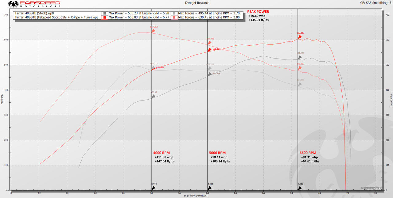 As tested on our Dynojet, our Sport Catalytic Converters in conjunction with our X-Pipe and ECU Tune added 112 whp and 147 ft/lbs of torque at 4000 RPM. Further up the rev range, this setup gives you major grunt as well: 81 whp and 64 ft/lbs of torque at 6600 RPM. Peak power is up by 70 whp and 135 ft-lbs of torque.